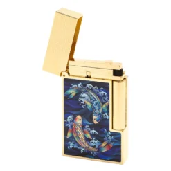 The lighter features a traditional flame and is equipped with a flint roller, making it easy to ignite. The body of the lighter is made of brushed brass with yellow gold plating, giving it an elegant and sophisticated look. The front of the lighter features a printed Koi illustration, which adds a unique touch of artistry to the design.