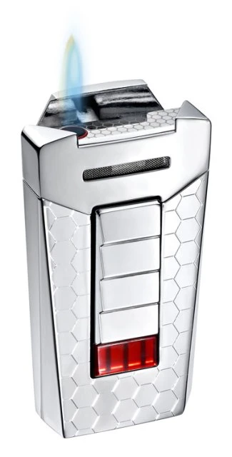 Standing tall and proud, Tonino Lamborghini presents the Aero, an impressive lighter designed to toast your favorite smoking device with its powerful wind-resistant flame. This lighter features a titanium plated polished body covered with a honeycomb pattern and impressive accents. The front, back and top of the lighter is branded with �Tonino Lamborghini” printed in a silver cursive font. On the back, discover a fuel-level window to gauge the amount of butane left in the lighter. To ignite the single jet flame, flip open the top and press down on the jagged polished silver tone button on front of the light right above the red stone to release a flame that will toast your cigar or cigarette in a matter of seconds. Built with premium and packaged in a high quality black leather case trimmed with red leather, order today! Dimensions: Height : 2.50 inches Width : 1.45 inches Thickness : 0.50 inches Weight: 2.70 oz Honeycomb Pattern Polished Finish Fuel-Level Window Comes in Black and Red Leather Case
