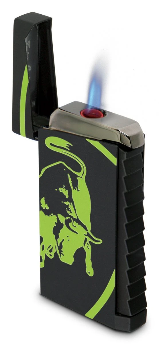 Black Rubberized Finish; Black Matte Cigar Lighter; Green Bull Logo; Single Jet Wind-Resistant Angled Flame; Dual Action Ignition (Flip Top Open and Push Full Side Ignition); Side Fuel Viewing Level (Turns Red when Filled); Butane Refillable; 2.63 Inches (Length) x 1.45 Inches (Width) x .47 Inches (Depth); 3 oz (Weight); Includes Manufacturer’s Limited 2-Year Warranty, Authenticity Card, and Lighter Instructions; Comes in Black and Red Accented Rubberized Box with Velvet Lined Interior, Bull Logo Embossed on Top; Ships Empty of Butane;