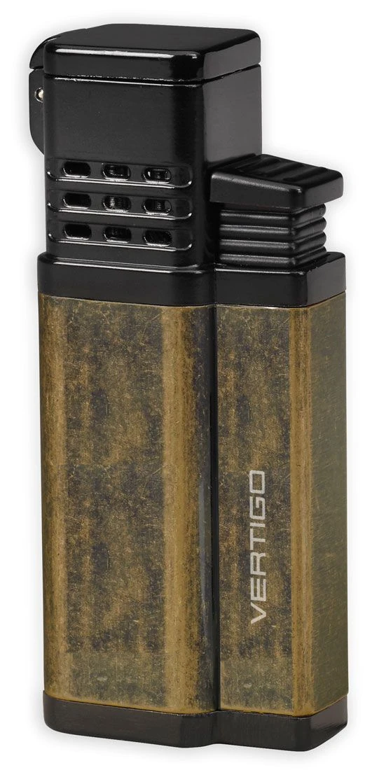 The Vertigo Conquistador Quad Torch Gold Lighter is a single action ignition with a high-powered quad wind-resistant jet flame. The built-in cigar punch and large fuel tank make this a perfect accessory for cigar smokers. A large fuel tank window ensures you never unexpectedly run out and the flame adjuster allows you to pick a flame height that works best for you. Please note that this lighter ships with no butane due to shipping regulations. Solid Gold Metal Body with Black Accents Quad Wind Resistant Torch Lighter, Single Action Ignition; Built-in 7mm Cigar Punch Dimensions: 3.1 inches x 1.25 Inches x 0.8 Inches, Weight: 3.2 Ounces Large Fuel Tank; Large Flame Adjuster; Extra Large Viewing Window Lifetime Warranty When Registering Product Online