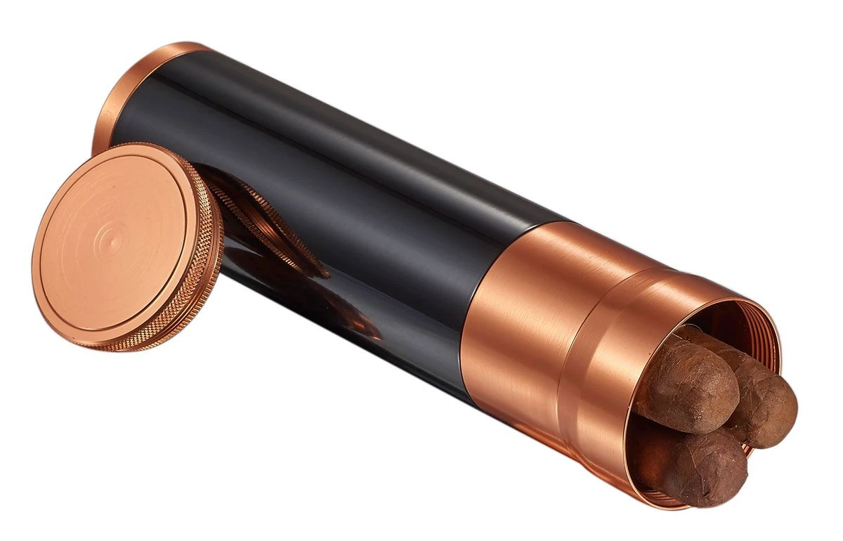 Made in a black with copper aluminum finish, cylindrical design. Comes with a built in humidifier that is excellent for preserving up to 3 cigars depending on there gauge. Is also great for travel so you can enjoy your favorite cigars on the go. Buy yours today!