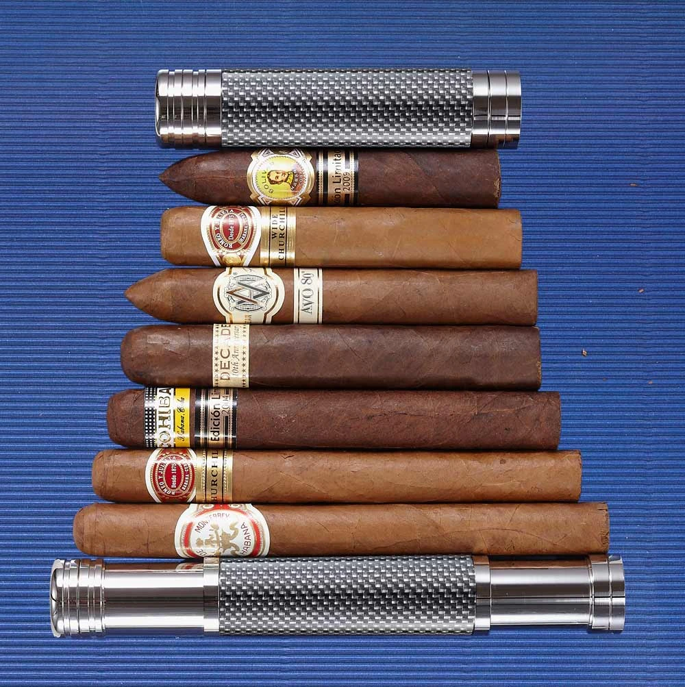 If you can only carry one cigar tube, but enjoy different cigars at different times, the Kinetic II is a perfect case. The stainless steel and carbon fiber tube telescopes at each end, making it one of the most versatile single-carry cases available. From fully contracted at just around 5 inches, you can choose whether to pull out one end for a 6.5-inch tube or fully extend both sides to 8 inches long. From Corona to Churchill, this case will keep your 56 gauge cigars safe until you can enjoy them. Pair this with a Dobrev carbon fiber lighter and MiniBrev cutter for the perfect set. A must-have accessory for travel, golf, or just to keep a cigar on hand, the Kinetic II makes a wonderful gift.