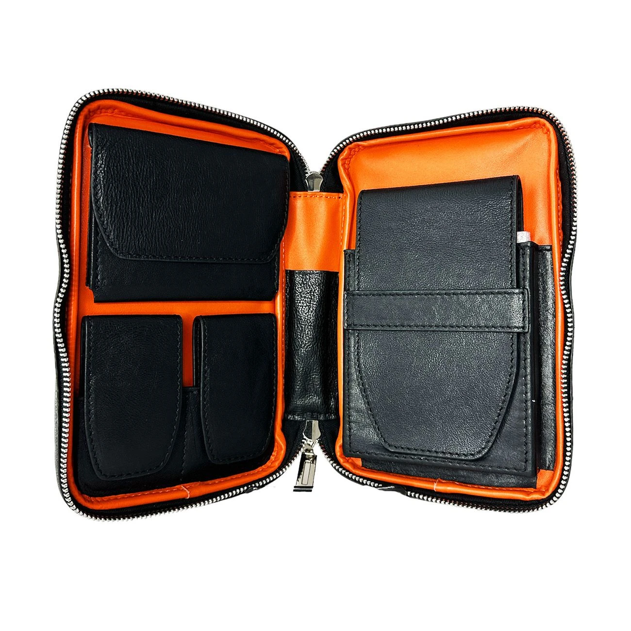 Zipped up travel case that opens to reveal pockets for cigars (5 count), cigar lighter, cigar cutter/ pokey, and business cards.