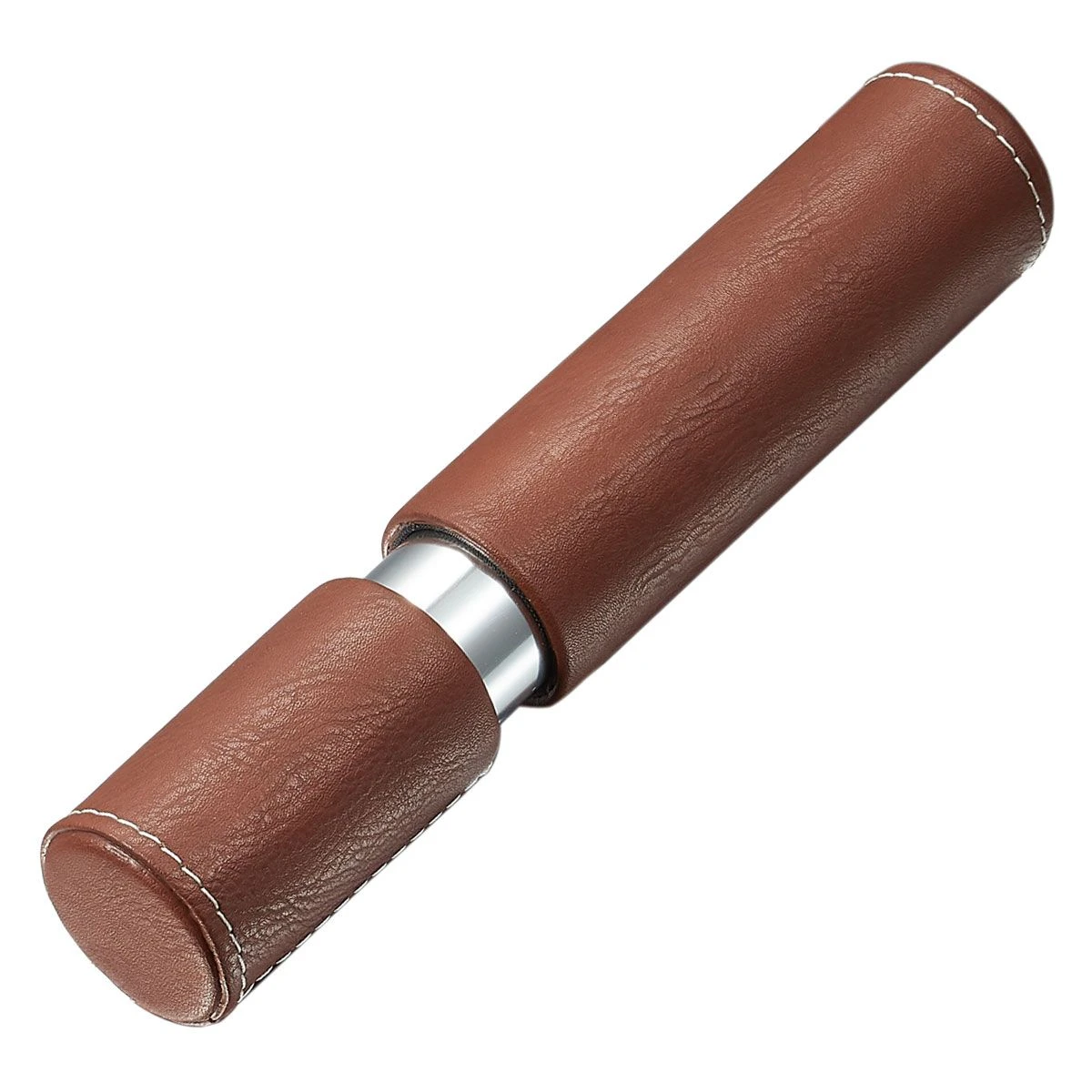 This Cigar Case makes an excellent choice for anyone looking to carry one of their favorite cigars out for an evening. Featuring a rich brown exterior and bright stainless steel construction, this case will keep your cigar safe and sound until you are ready to enjoy it at your leisure Holds One Cigar, Brown Leather with White Stitching and Stainless Steel Leather Pull off top Sturdy Case Compact for Easy Storage and Carry Approximate Dimensions 1.5 inches diameter, 8 inches long (Adjustable for slightly longer cigars) Great gift for a cigar smoker