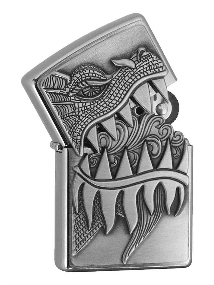 Well if you have the power to summon fire with a snap of your fingers, may as well have a dragon to get the job done for you! This Zippo lighter features an embossed Dragonhead on either side of the cap, giving you an actuall fire breathing lizard for whenver you need something lit! The interior of the jaw even features some mock flames for the added asthetic. Brushed Chrome with Dragon Head Emboss ; Signature Zippo Shape and Design Two Step Ignition; Flip Cap and Roll Flint to Ignite the Soft Torch Flame Approximate Dimensions: 2.3 x 1.6 x 0.5 inches Constructed in the USA; Flame Resistant Torch perfect for any situation Due to Shipping Regulations this Lighter does not ship filled with lighter fluid