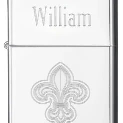 Royalty has nothing on you with this personalized Zippo lighter featuring an engraved Fleur de Lis! The Fleur de Lis has been a representation of nobility and is beautifully engraved into the polished chrome surface for your enjoyment. Click open the cap, that’s engraved with your name, for a wind-proof flame that will last as long as your legacy! This symbol of your regality fits perfectly in your pocket or purse and is easily refilled with Zippo lighter fluid. Whether for yourself, or a loved one, this design is one of a kind and easily yours! Fleur De Lis Symbol Engraved on High Polish Chrome Finish Flint Ignition; Windproof Flame; Signature Zippo Click Dimensions: (L) 2.25 in x (W) 1.5 in x (H) 0.5 in Made in the USA; Zippo Lifetime Guarantee; Recommend Use of Zippo Lighter Fluid Comes Packaged in Black Zippo Branded Box